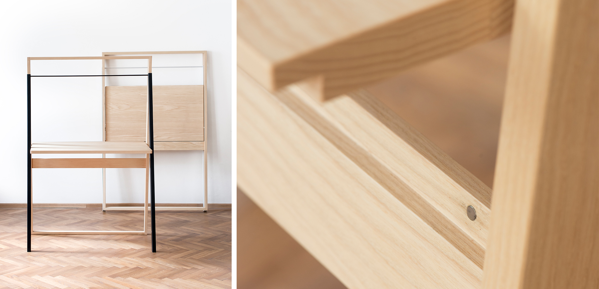 FOLDER is produced in small series, made of high-quality solid wood (ash) and sintered steel, the latter available in various colors. The simple structure is paired with crafted details: the finely processed wood, the magnet-lock tabletop, the smooth closing mechanism or the honest wood joints make this workstation a lovely centerpiece of the home office.